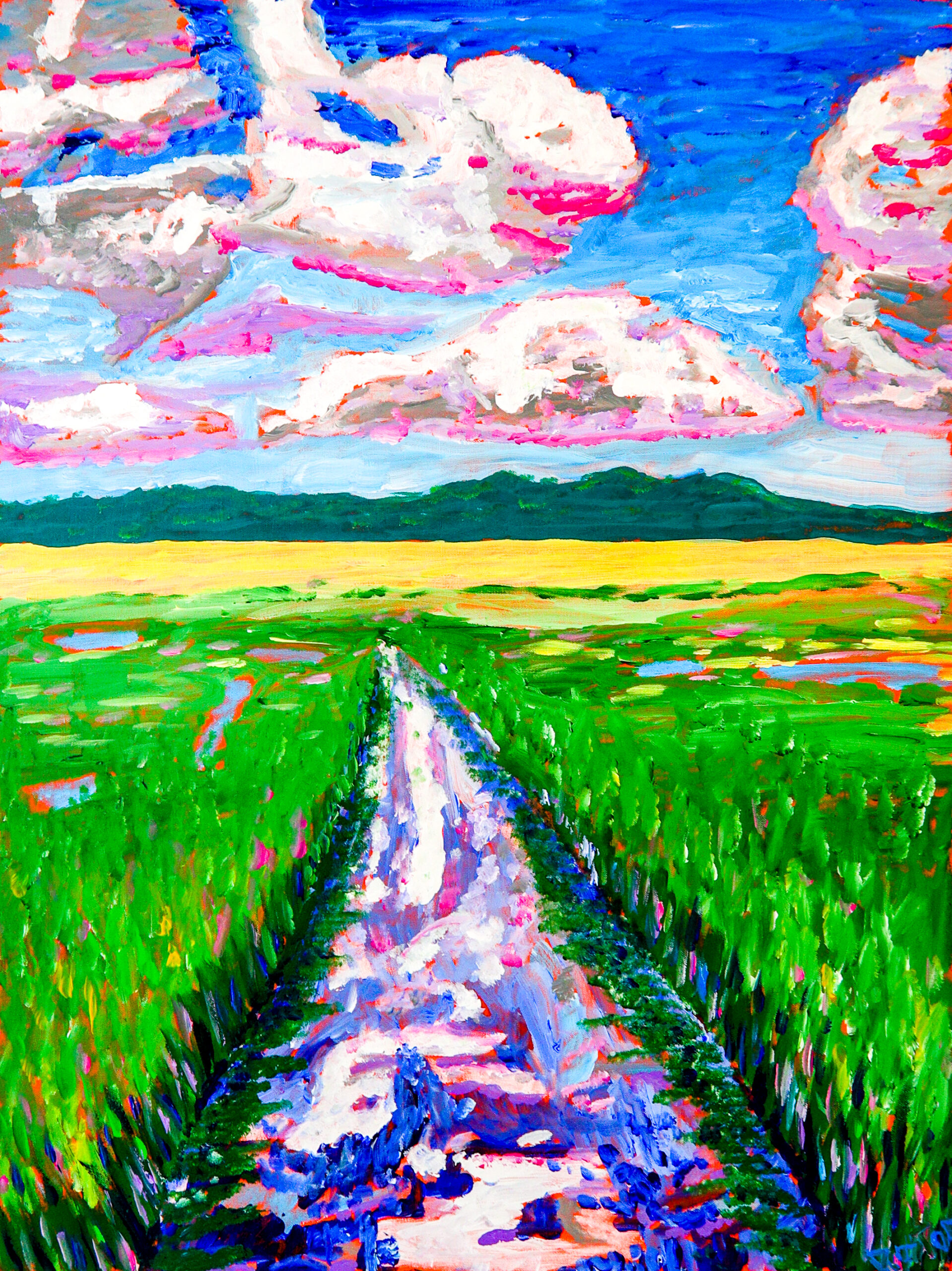 If you have never been to the low country of South Carolina you should go. At sunrise and sunet you can seeevery color in the spectrum. Thats what I tried to recreate here. A colorful path winds through lush green fields under a sky filled with bright, expressive clouds. The landscape is full of vivid, dynamic brushstrokes. To purchase this painting click here.
