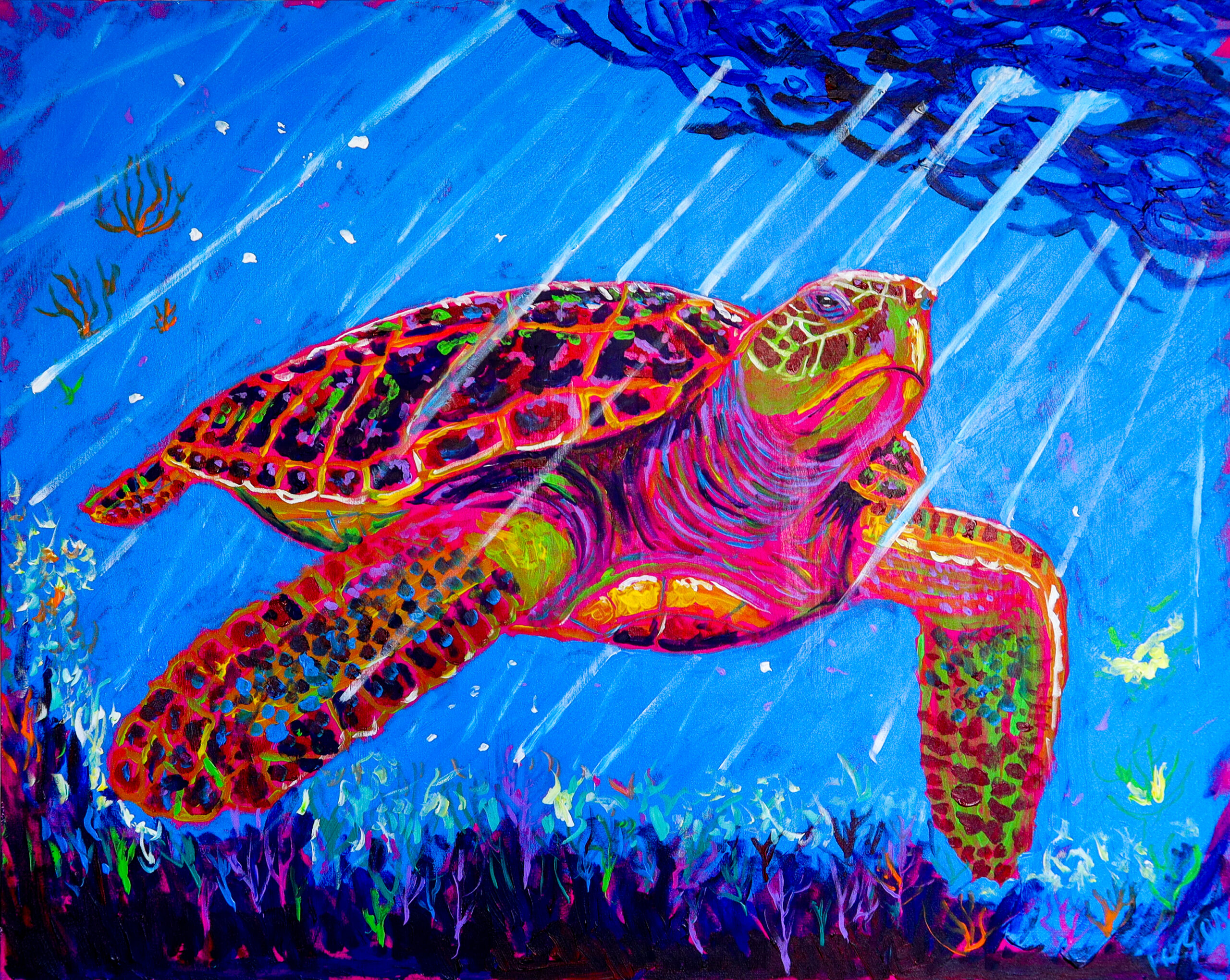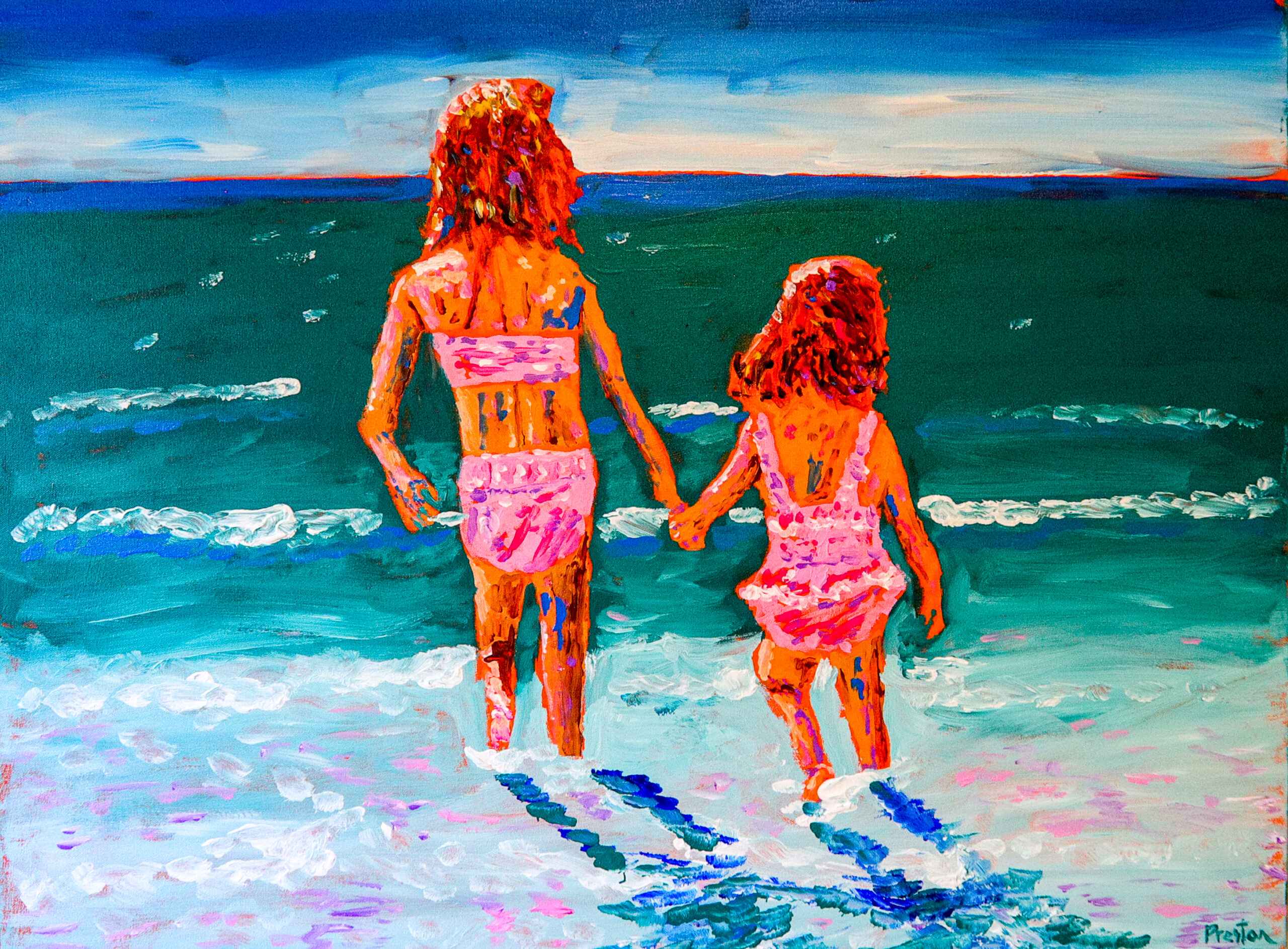One of my foundest memories is of my daughters when they were young. They are older now but I was hoping to capture some of those memories. Hopefullly it captures some memories for you as well. Two young sisters in swimsuits walk hand in hand toward the ocean under a bright blue sky. Their backs are turned, capturing a moment of carefree innocence by the shore. Click here to purchase this painting.